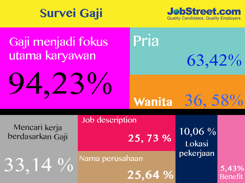 Dari data yang kami dapat ada 63.42% pria dan 36.58% wanita yang mengikuti survei tersebut. Hasilnya sebesar 94.23% karyawan di Indonesia menyatakan bahwa gaji menjadi hal terpenting bagi mereka untuk menentukan karir yang mereka pilih.